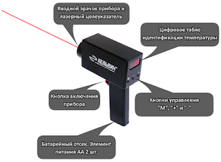 - Температура поверхности образца измеряется «Кельвином». Значение излучательной способности подбирается до тех пор, пока индикатор прибора не покажет известную температуру образца.